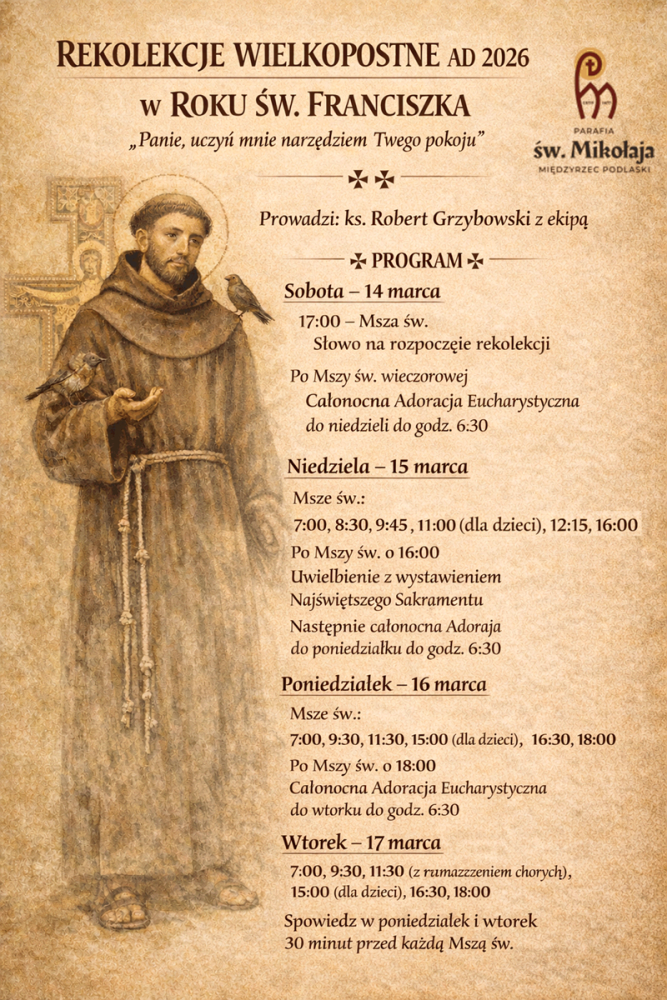 Kolejne rekolekcje odbędą się w parafii św. Mikołaja w Międzyrzecu Podlaskim w dniach 15–17 marca.