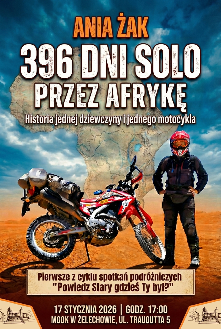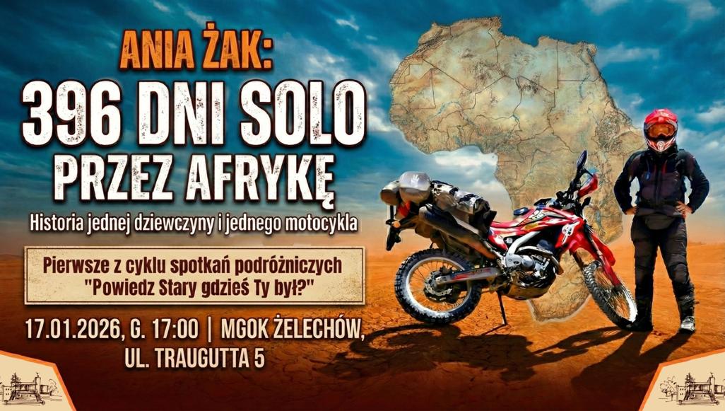 Spotkanie podróżnicze poświęcone samotnej, motocyklowej wyprawie przez Afrykę z udziałem Ani Żak odbędzie się w sobotę 17 stycznia o godz. 17:00 w sali widowiskowej Miejsko-Gminnego Ośrodka Kultury w Żelechowie. Wydarzenie zatytułowane „396 dni solo przez Afrykę” zainauguruje cykl spotkań „Powiedz Stary, gdzieś Ty był?”.