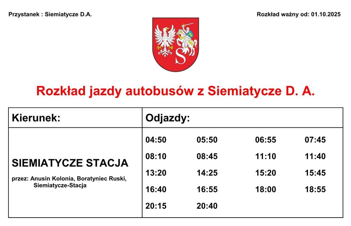 Pociągiem można wyruszyć z pięknego, wyremontowanego dworca PKP Siemiatycze i pojechać do Siedlec, Czeremchy, Hajnówki, a nawet do Warszawy czy Gdyni. Jednak podróż często kończyła się na samym początku, bo z Siemiatycz od lat nie ma połączeń autobusowych na dworzec. 8 km dzielące Siemiatycze od Siemiatycz Stacji, dla wielu osób było do tej pory barierą nie do pokonania. O sprawie wiele już było powiedziane i napisane. Od gadania czas do działania. Nareszcie!Od 1 październik powiat siemiatycki uruchamia pilotażową linię komunikacji autobusowej między Siemiatyczami a Siemiatyczami Stacją. Zaplanowano kilkanaście połączeń autobusowych na dobę. Pierwszy autobus wyjedzie z Siemiatycz o godz. 4.50, a ostatni o 20.40. Z dworca pierwszy autobus pojedzie w kierunku Siemiatycz o 5:15, ostatnie kurs ruszy o 21:05.