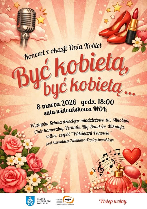 Tytuł koncertu nawiązuje do niezapomnianego przeboju z repertuaru Alicji Majewskiej – artystki, której utwory od lat wzruszają i inspirują kolejne pokolenia słuchaczy. Na scenie sali widowiskowej Miejskiego Ośrodka Kultury wystąpią: schola dziecięco-młodzieżowa parafii św. Mikołaja, chór kameralny Veritatis, Big Band parafii św. Mikołaja, soliści oraz zespół Wdzięczni Panowie, w którym występuje m.in. burmistrz Międzyrzeca Podlaskiego Paweł Łysańczuk.Wydarzenie będzie muzycznym hołdem dla kobiet i okazją do wspólnego świętowania tego wyjątkowego dnia. Koncert „Być kobietą, być kobietą” odbędzie się w niedzielę, 8 marca. Rozpocznie się o godzinie 18.00.