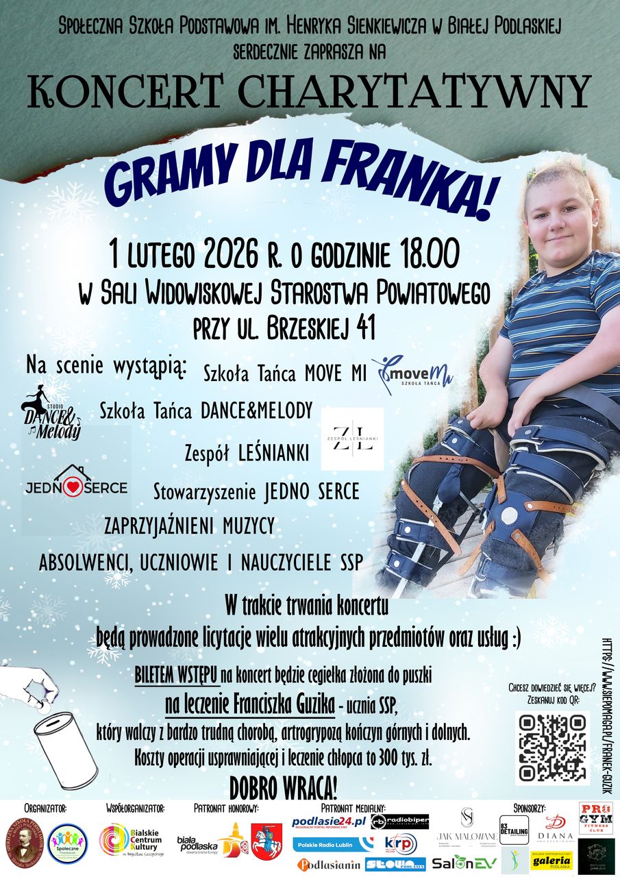 „Gramy dla Franka!” – to hasło koncertu charytatywnego, który odbędzie się już w najbliższą niedzielę, w sali widowiskowej Starostwa Powiatowego w Białej Podlaskiej. Koncert organizuje Społeczna Szkoła Podstawowa im. Henryka Sienkiewicza w Białej Podlaskiej. Wydarzeniu patronuje Katolickie Radio Podlasie oraz portal Podlasie24.