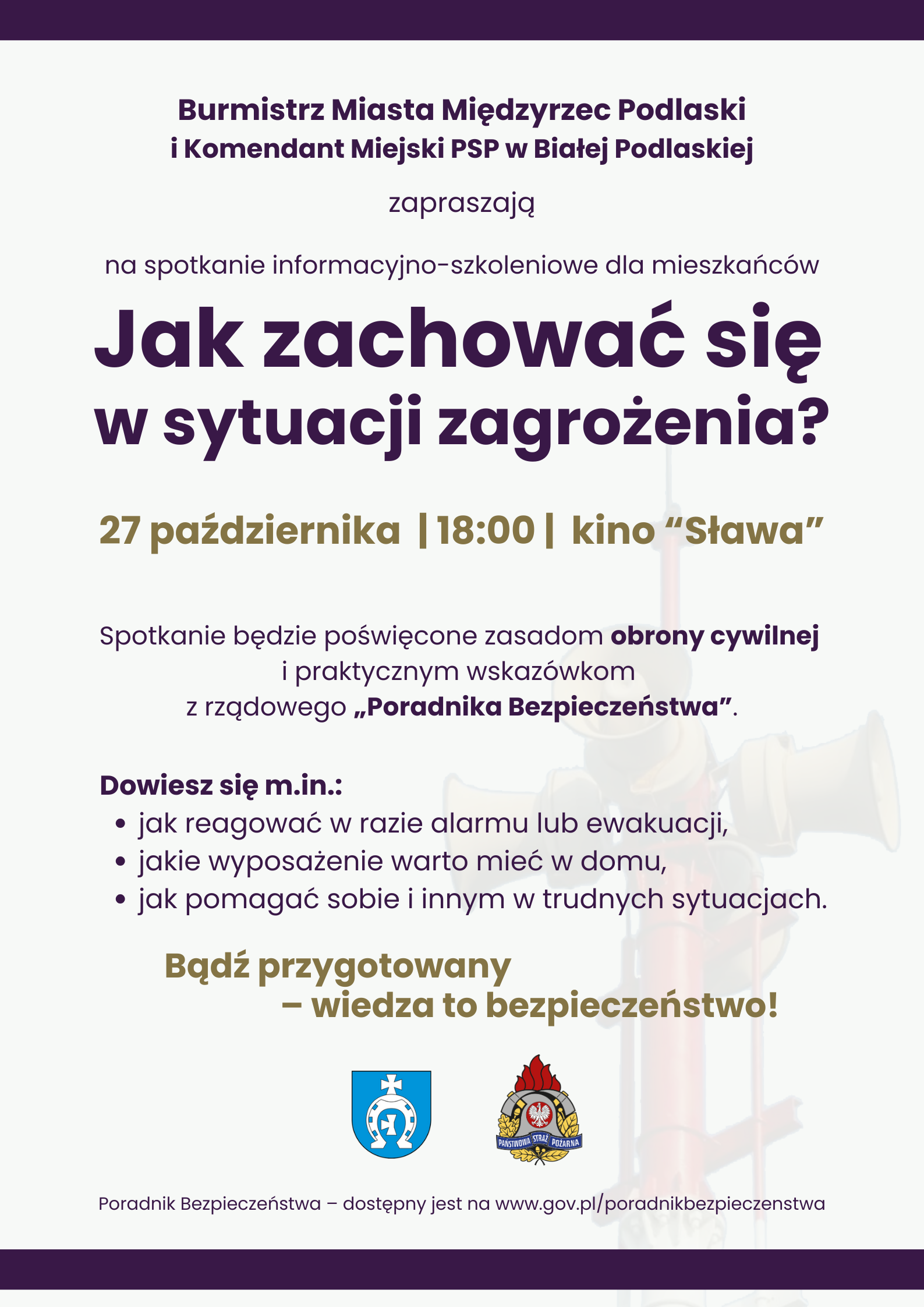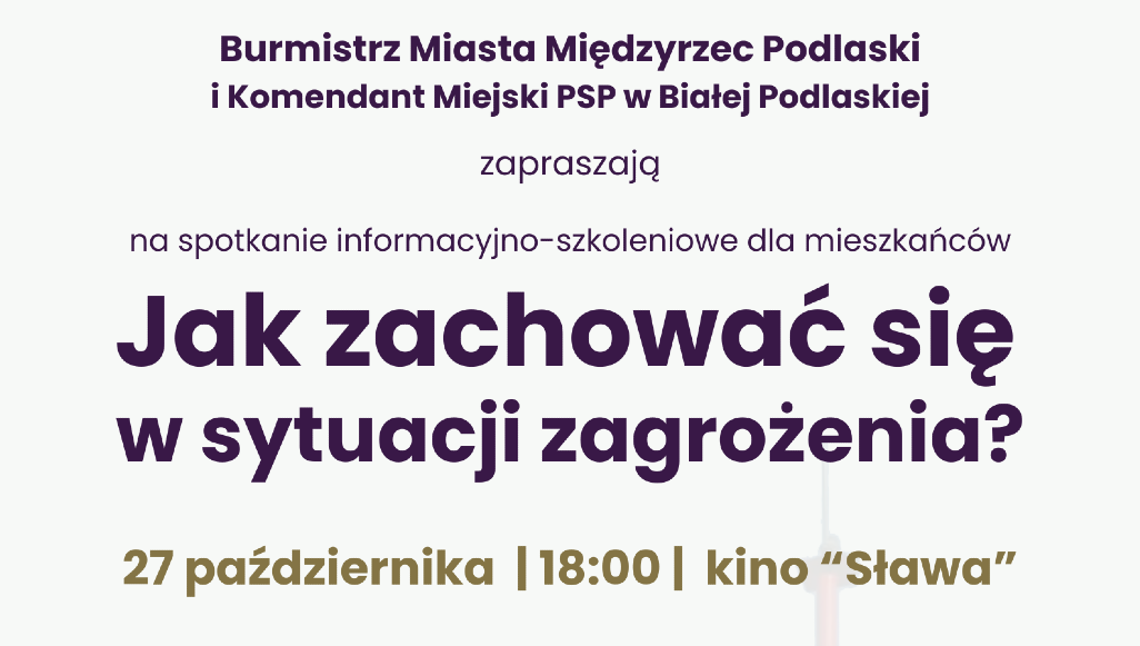Spotkanie to ma na celu przygotowanie lokalnej społeczności na różne rodzaje zagrożeń oraz dostarczenie praktycznych wskazówek, jak reagować w nagłych wypadkach.– Spotkanie informacyjno-szkoleniowe dla mieszkańców Międzyrzeca - „Jak zachować się w sytuacji zagrożenia?” - odbędzie się w sali widowiskowej Miejskiego Ośrodka Kultury w Międzyrzecu, w poniedziałek, 28 października. Rozpocznie się o godzinie 18:00 – mówi Paweł Łysańczuk burmistrz miasta Międzyrzec Podlaski.