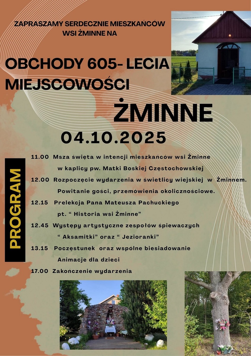 Uroczysta Msza Święta, odprawiona o godz. 11:00 w intencji mieszkańców wsi, w kaplicy Matki Boskiej Częstochowskiej, rozpocznie obchody 605-lecia miejscowości Żminne (gm. Siemień). Wydarzenie będzie wyjątkową okazją do wspólnego przypomnienia sobie historii miejscowości, osób z nią związanych oraz oddania hołdu tym, którzy ją tworzyli. Uroczyste obchody odbędą się w sobotę, 4 października.