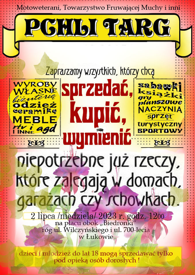 Każdy kto chce coś sprzedać albo kupić powinien pojawić się na Pchlim Targu w Łukowie. To miejsce, gdzie będzie można kupić, sprzedać lub wymienić się przeróżnymi rzeczami. Handel odbywać się będzie na placu przy skrzyżowaniu ulic Wilczyńskiego i 700-lecia. Początek wydarzenia, na które zapraszają Towarzystwo Fruwającej Muchy, Motoweterani i inni, a w tym również Andrzej Zdrojewski, godzina 12.00.