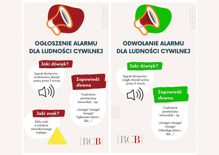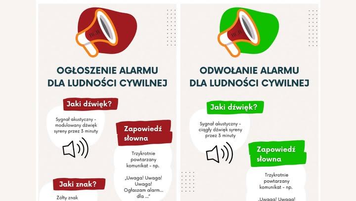 Pierwszy – modulowany – dźwięk syreny, trwający 3 minuty, oznacza ogłoszenie alarmu. Natomiast drugi, 3-minutowy ciągły dźwięk syreny, będzie oznaczał odwołanie alarmu.Test systemu ostrzegania i alarmowania ma charakter edukacyjny. Służy podniesieniu bezpieczeństwa wszystkich mieszkańców. – Dzięki temu, w sytuacji realnego zagrożenia, każdy z nas będzie potrafił szybko i właściwie zareagować – mówi Paweł Łysańczuk, Burmistrz Miasta Międzyrzec Podlaski.